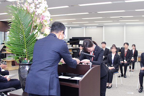 入社式では、下村社長が新入社員一人ひとりに辞令を交付しました。